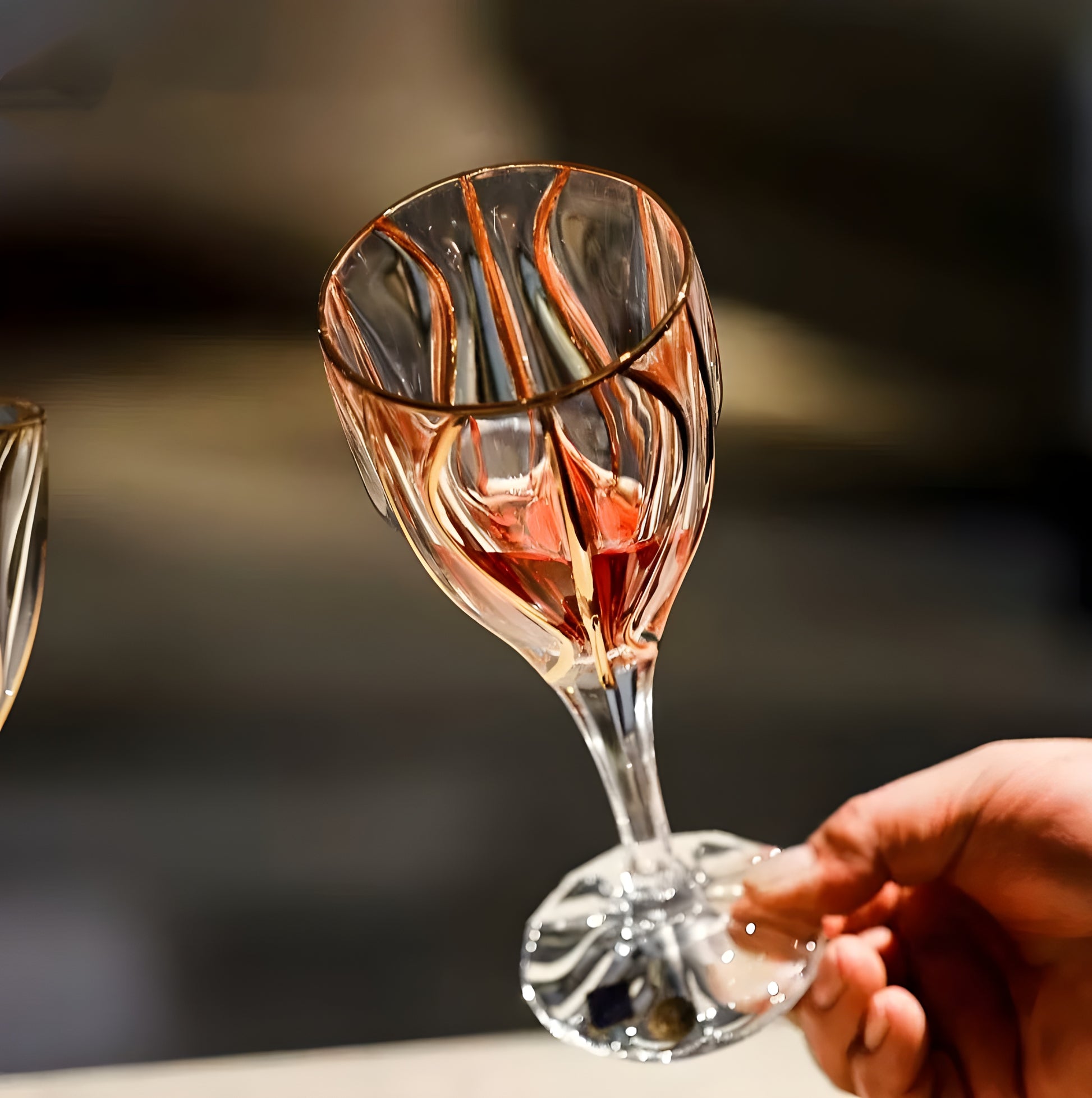 Lavorazione e design Cristallo lavorato a caldo con pattern ondulato in rilievo che corre lungo i corpi di calici e decanter. Finiture dorate applicate a mano su bordo e collo, per un contrasto elegante con la trasparenza del vetro. Decanter con base sfaccettata, corpo svasato e tappo coordinato; calici con coppa a tulipano (vino) e profilo slanciato (champagne) per valorizzare bouquet ed effervescenza. Origine cristallo: Boemia, Repubblica Ceca.