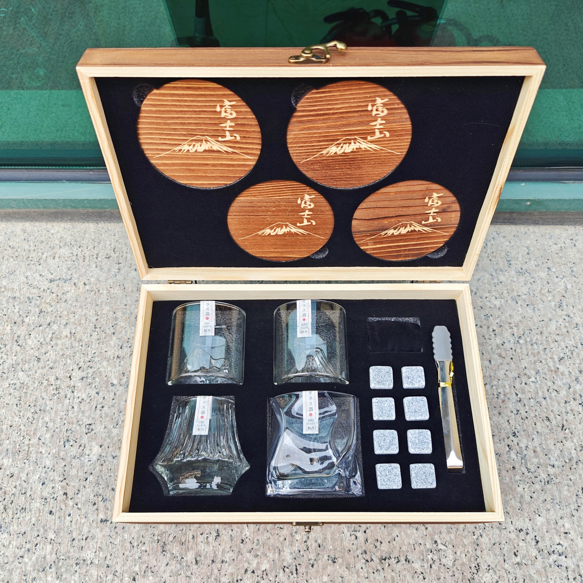“Four Seasons” è il set che racconta un anno di sapori in quattro forme. Il cofanetto in legno inciso si apre svelando quattro bicchieri giapponesi, ciascuno con una personalità distinta: un profilo irregolare che cattura la luce come foglie mosse dal vento, un lowball essenziale con fondo scolpito che concentra gli aromi, un cilindro con cupola interna pensato per una rotazione morbida, e una coppa scanalata dalla texture tattile che invita alla lentezza. Il vetro, limpido e brillante, valorizza i riflessi ambrati mentre i sottobicchieri in legno aggiungono calore naturale alla mise en place.